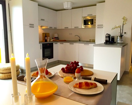 Ein großer, moderner, klimatisierter Essbereich mit offener Küche lädt zum Kochen und Sitzen ein falls es draußen mal nicht so schön sein sollte - also fast nie!