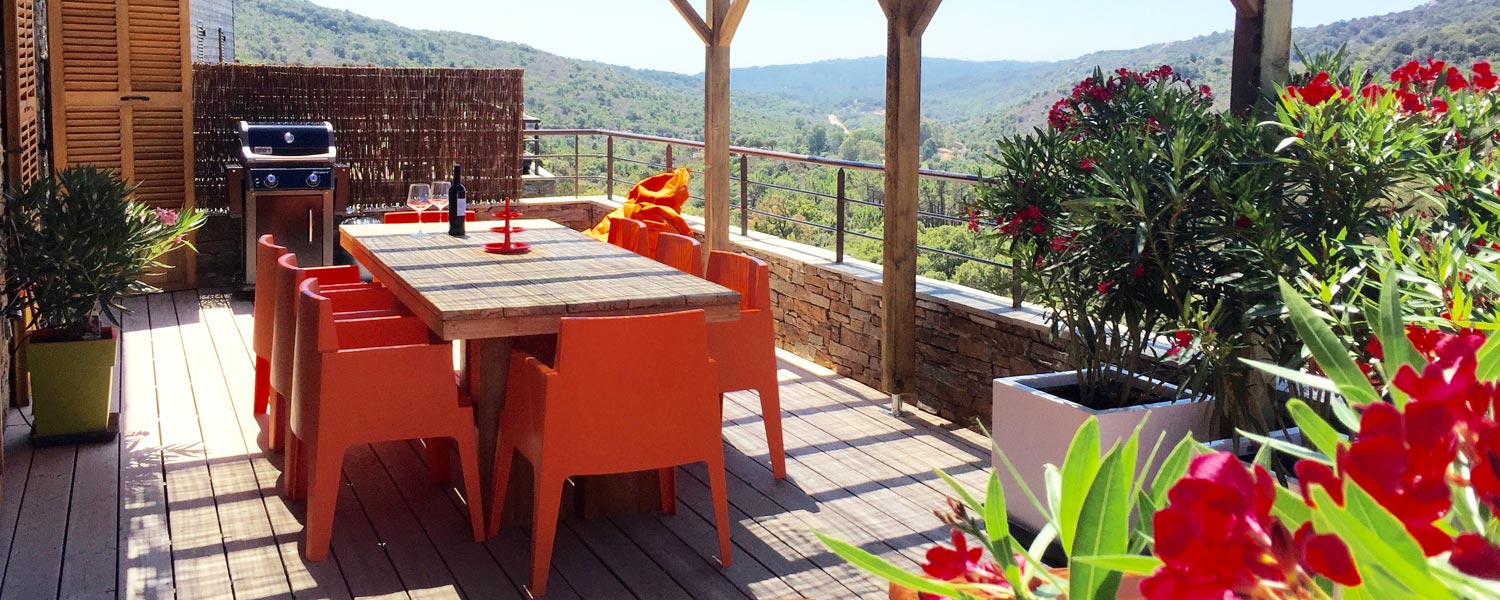 Wir begrüßen Sie in unserem wunderschönen, geschmackvoll eingerichteten Steinchalet mit riesiger (40qm) Terrasse mit Blick in die duftende Macchia und die korsischen Hügel im Süden Korsikas.